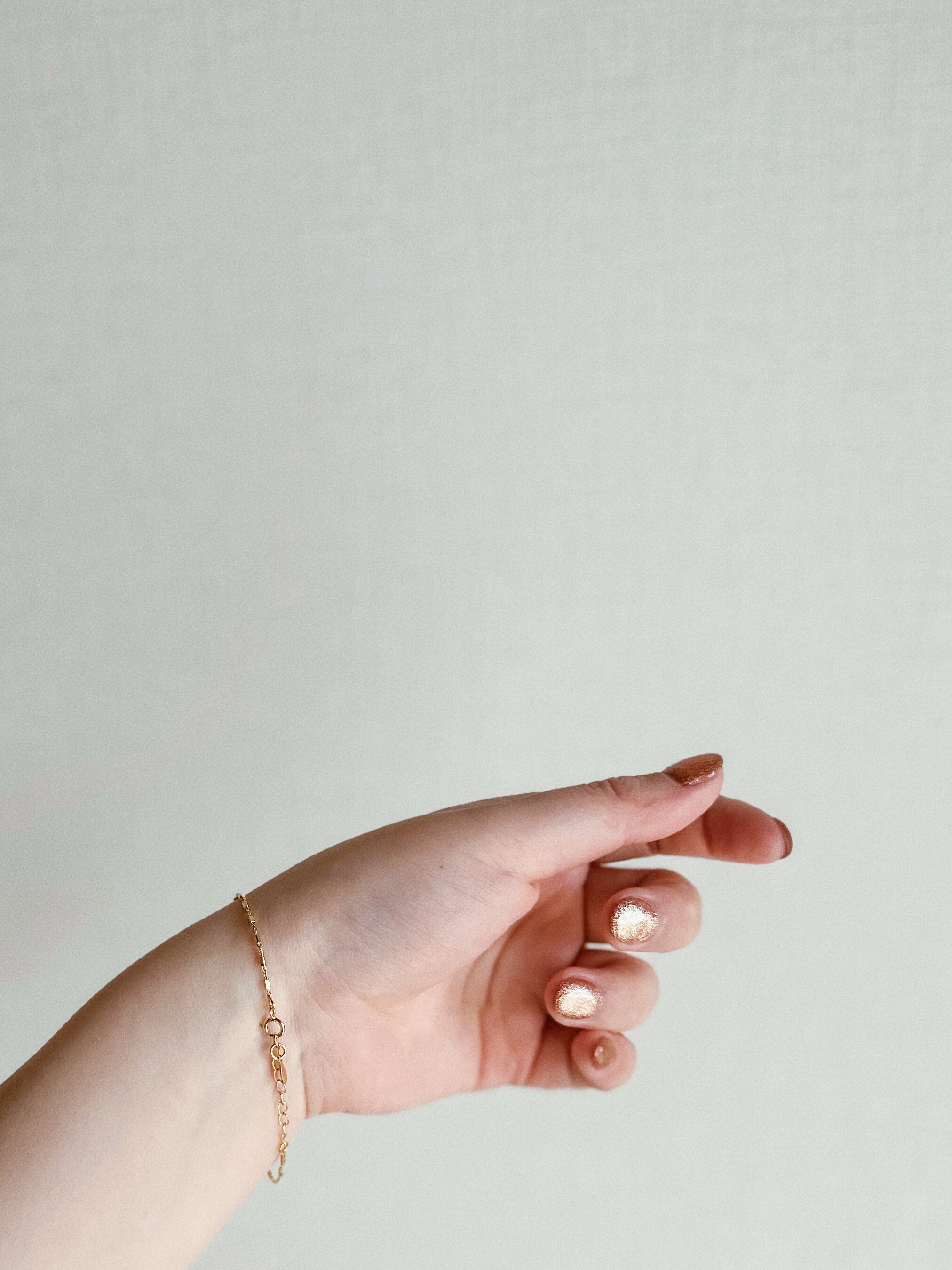 小さな長方形を一つずつ細かく繋いだデザインのチェーンブレスレット。